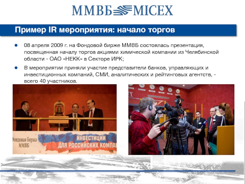 ММВБ состоялась презентация, посвященная началу торгов акциями химической компании из Челябинской области - ОАО «НЕКК» в Секторе ИРК;