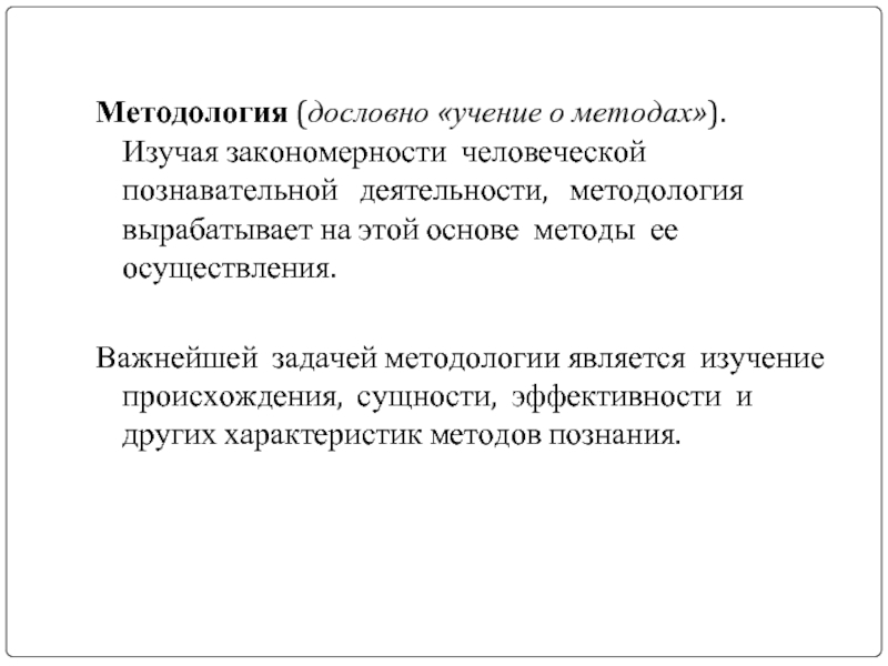 Важнейшей задачей методологии является изучение происхождения, сущности, эффективности и других характеристик методов познания.