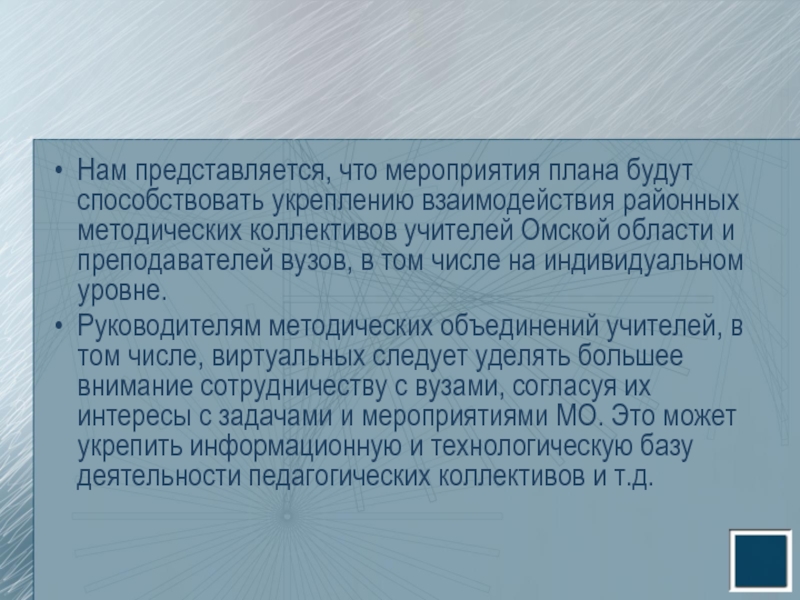 Руководителям методических объединений учителей, в том числе, виртуальных следует уделять большее внимание сотрудничеству с вузами, согласуя их интересы с задачами и мероприятиями МО. Это может укрепить информационную и технологическую базу деятельности педагогических коллективов и т.д.