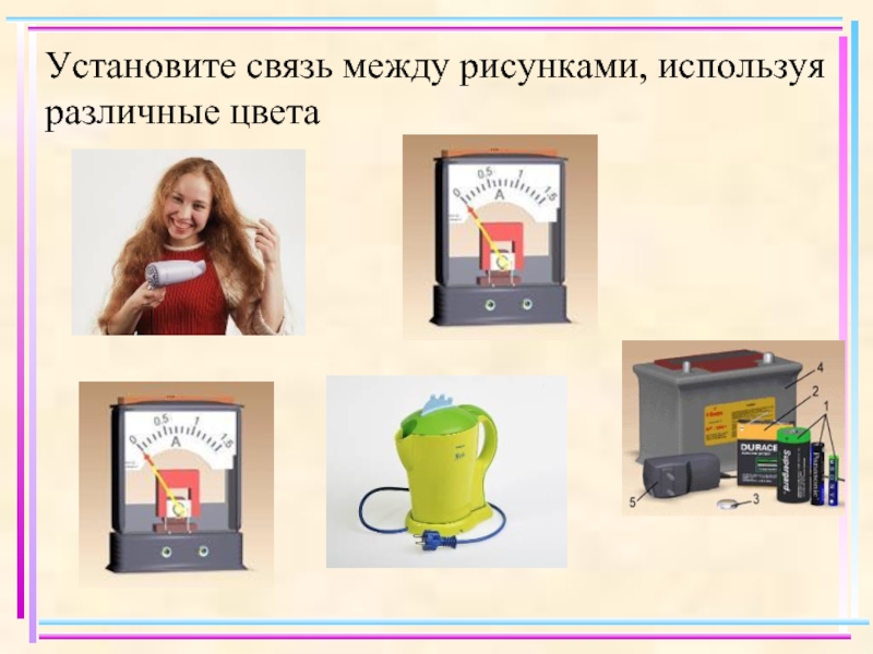 Слайд 7Установите связь между рисунками, используя различные цвета
