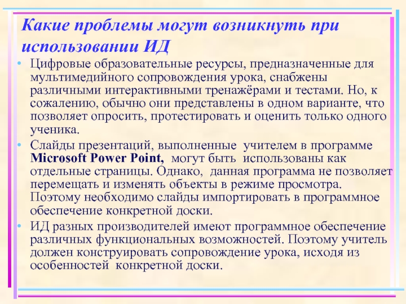 ИД разных производителей имеют программное обеспечение различных функциональных возможностей. Поэтому учитель должен конструировать сопровождение урока, исходя из особенностей конкретной доски.