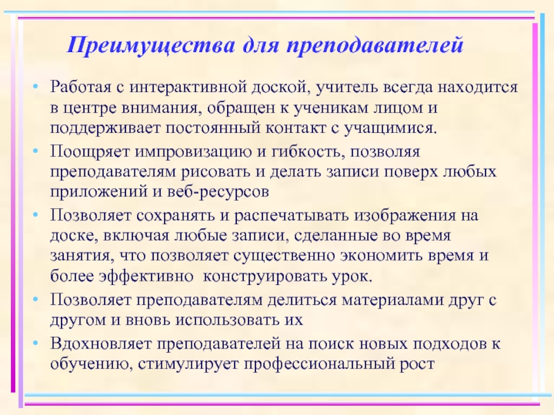 Делает занятия интересными и увлекательными для преподавателей и учащихся благодаря разнообразному и динамичному использованию ресурсов, развивает мотивацию