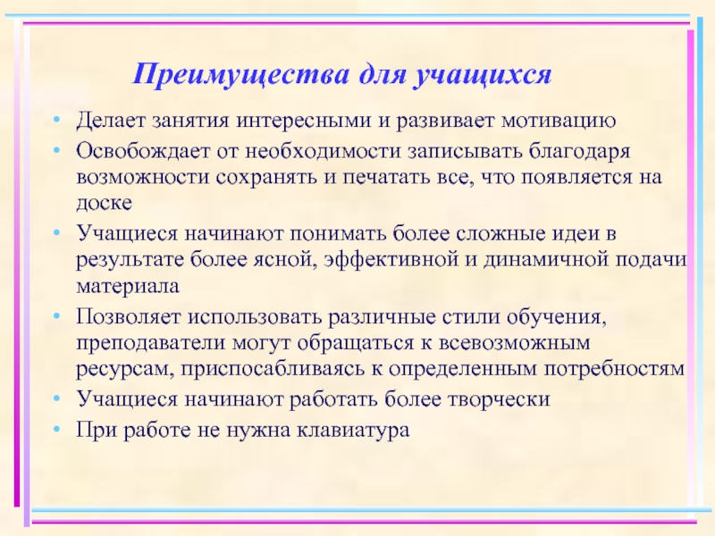 Позволяет использовать различные стили обучения, преподаватели могут обращаться к всевозможным ресурсам, приспосабливаясь к определенным потребностям