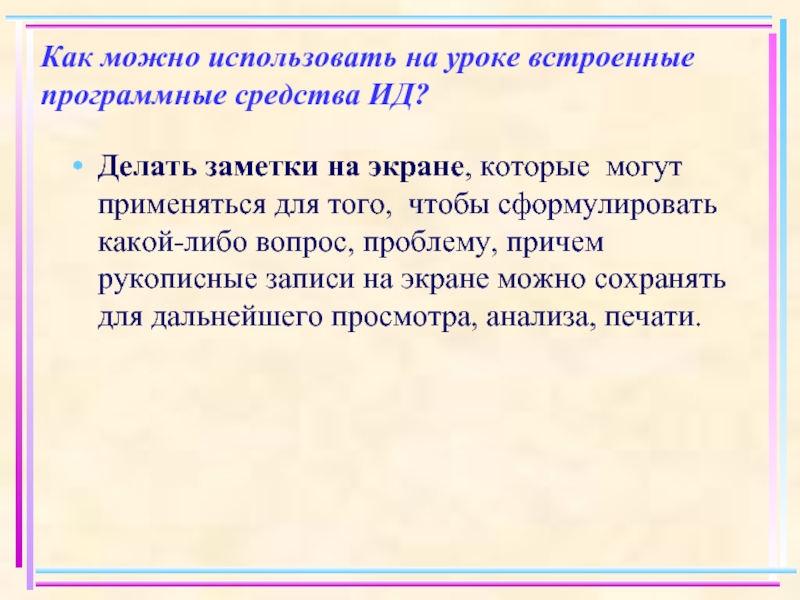 Слайд 10Как можно использовать на уроке встроенные программные средства ИД?