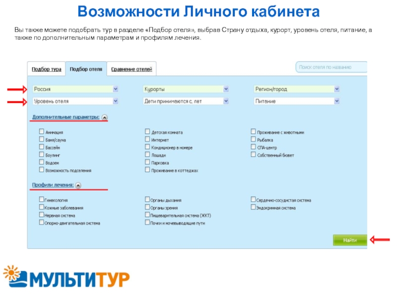 выбрав Страну отдыха, курорт, уровень отеля, питание, а также по дополнительным параметрам и профилям лечения.