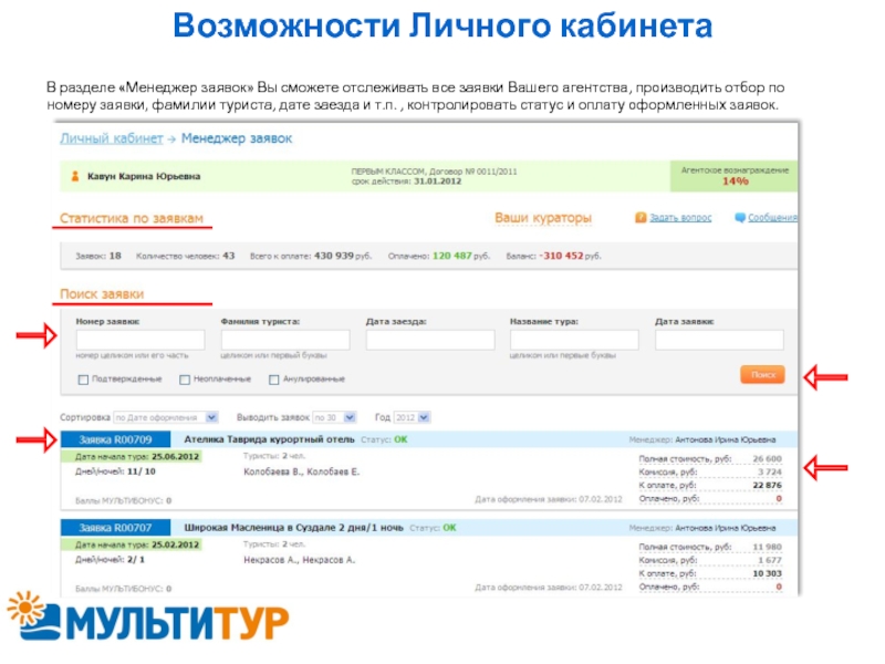 Вашего агентства, производить отбор по номеру заявки, фамилии туриста, дате заезда и т.п. , контролировать статус и оплату оформленных заявок.
