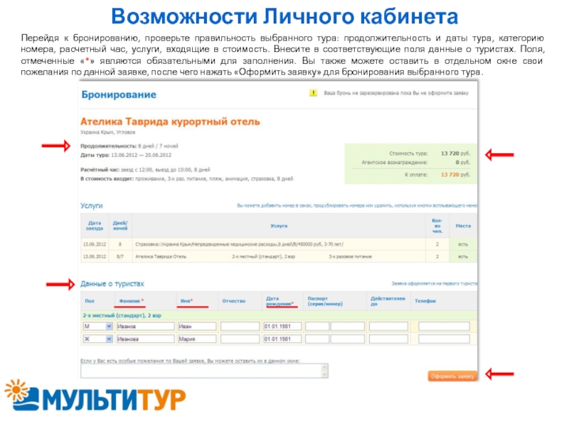 даты тура, категорию номера, расчетный час, услуги, входящие в стоимость. Внесите в соответствующие поля данные о туристах. Поля, отмеченные «*» являются обязательными для заполнения. Вы также можете оставить в отдельном окне свои пожелания по данной заявке, после чего нажать «Оформить заявку» для бронирования выбранного тура.
