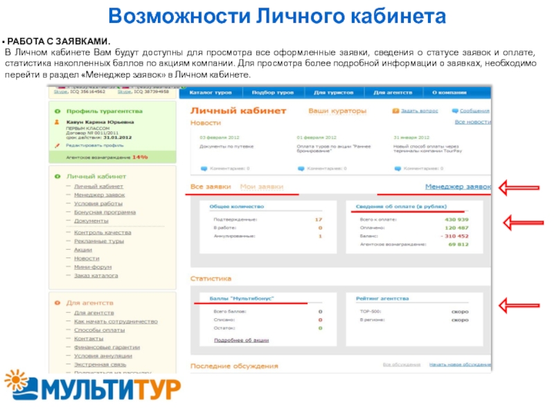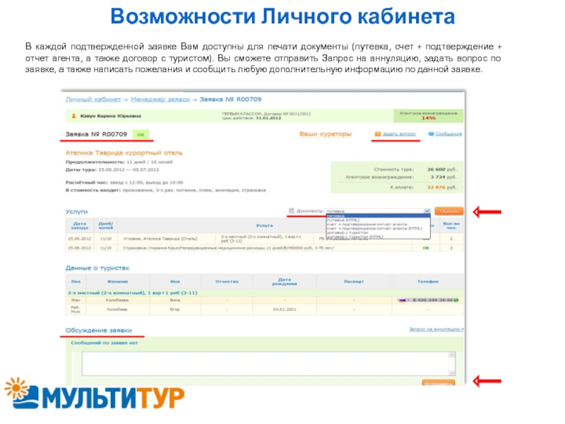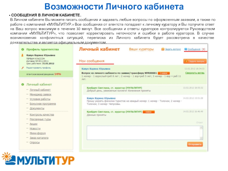 писать сообщения и задавать любые вопросы по оформленным заявкам, а также по работе с компанией «МУЛЬТИТУР.» Все сообщения от агентств попадают к личному куратору и Вы получите ответ на Ваш вопрос максимум в течение 30 минут. Все сообщения и ответы кураторов контролируются Руководством компании «МУЛЬТИТУР», что позволяет корректировать неточности и ошибки в работе кураторов. В случае возникновения конфликтных ситуаций, переписка из Личного кабинета будет рассмотрена в качестве доказательства и является официальным документом.