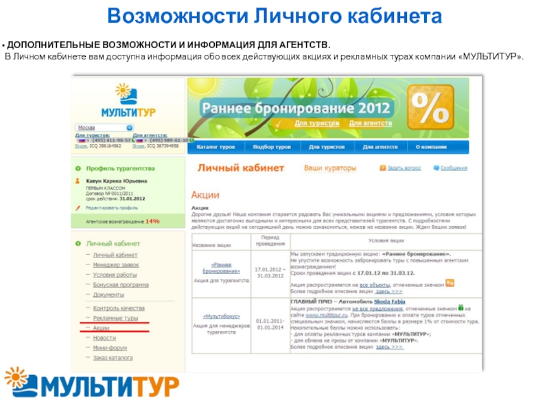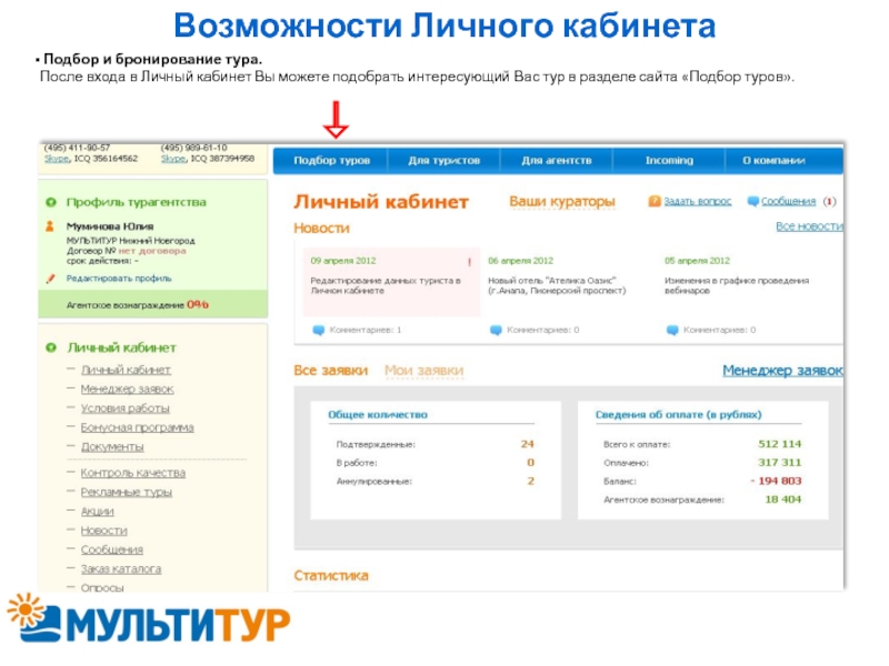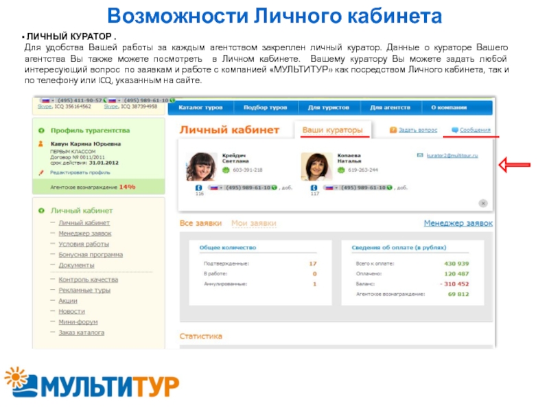 агентством закреплен личный куратор. Данные о кураторе Вашего агентства Вы также можете посмотреть в Личном кабинете. Вашему куратору Вы можете задать любой интересующий вопрос по заявкам и работе с компанией «МУЛЬТИТУР» как посредством Личного кабинета, так и по телефону или ICQ, указанным на сайте.