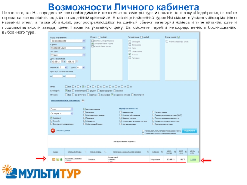 параметры тура и нажали на кнопку «Подобрать», на сайте отразятся все варианты отдыха по заданным критериям. В таблице найденных туров Вы сможете увидеть информацию о названии отеля, а также об акциях, распространяющихся на данный объект, категории номера и типе питания, дате и продолжительности заезда, цене. Нажав на указанную цену, Вы сможете перейти непосредственно к бронированию выбранного тура.