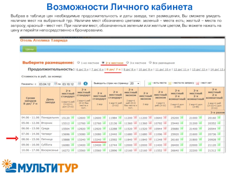 тип размещения, Вы сможете увидеть наличие мест на выбранный тур. Наличие мест обозначено цветами: зеленый – места есть; желтый – места по запросу; красный – мест нет. При наличии мест, обозначенных зеленым или желтым цветом, Вы можете нажать на цену и перейти непосредственно к бронированию.