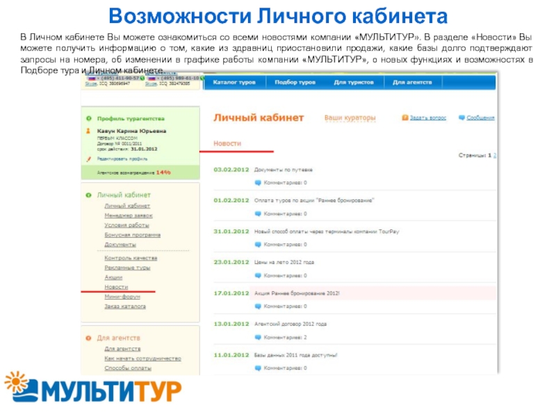 компании «МУЛЬТИТУР». В разделе «Новости» Вы можете получить информацию о том, какие из здравниц приостановили продажи, какие базы долго подтверждают запросы на номера, об изменении в графике работы компании «МУЛЬТИТУР», о новых функциях и возможностях в Подборе тура и Личном кабинете.