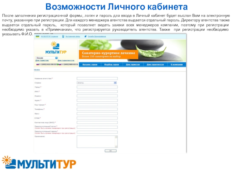 в Личный кабинет будет выслан Вам на электронную почту, указанную при регистрации. Для каждого менеджера агентства выдается отдельный пароль. Директору агентства также выдается отдельный пароль, который позволяет видеть заявки всех менеджеров компании, поэтому при регистрации необходимо указать в «Примечании», что регистрируется руководитель агентства. Также при регистрации необходимо указывать Ф.И.О. полностью.