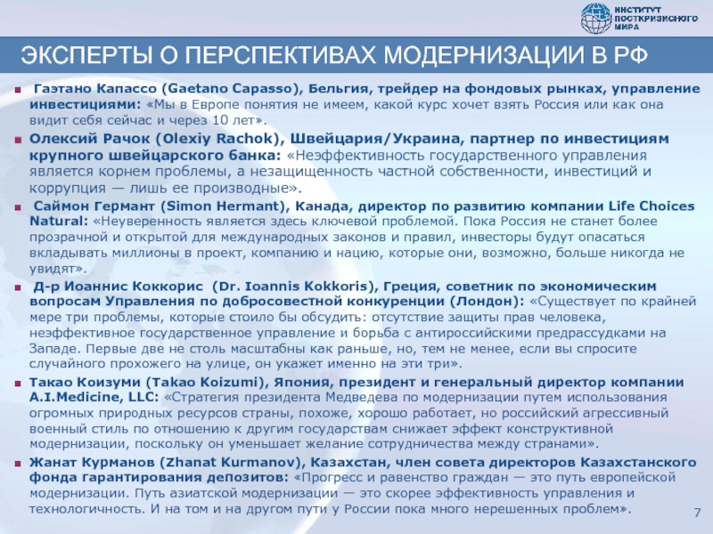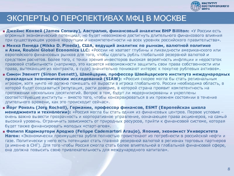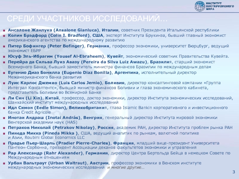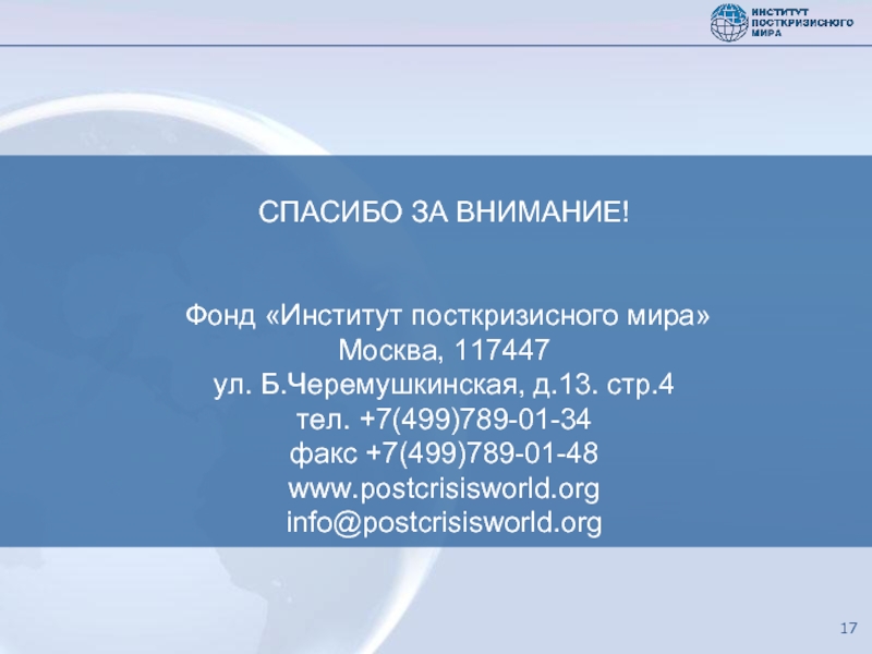 Фонд «Институт посткризисного мира» – независимый аналитический центр, создан в Москве в начале 2009 года по инициативе ряда российских организаций : Фонда «Общественное мнение» (www.fom.ru); НП «Бизнес-солидарность» (www.kapitalisty.ru), Фонда «Центр развития фондового рынка» (www.crfr.ru) и других.