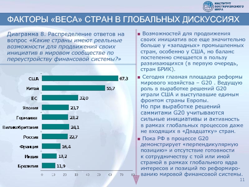 Диаграмма 8. Распределение ответов на вопрос «Какие страны имеют реальные возможности для продвижения своих инициатив в мировом сообществе по переустройству финансовой системы?»