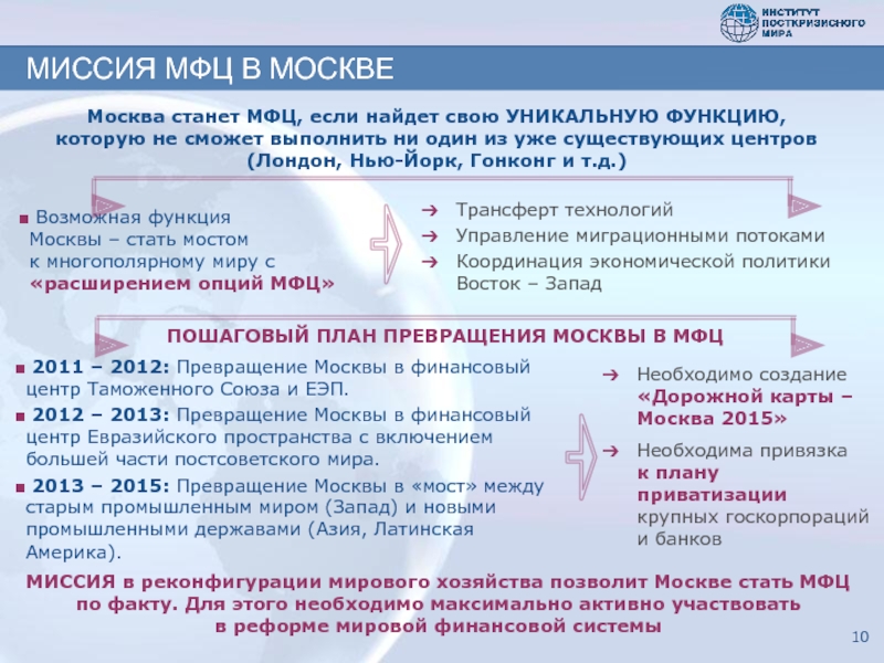 2012 – 2013: Превращение Москвы в финансовый центр Евразийского пространства с включением большей части постсоветского мира.