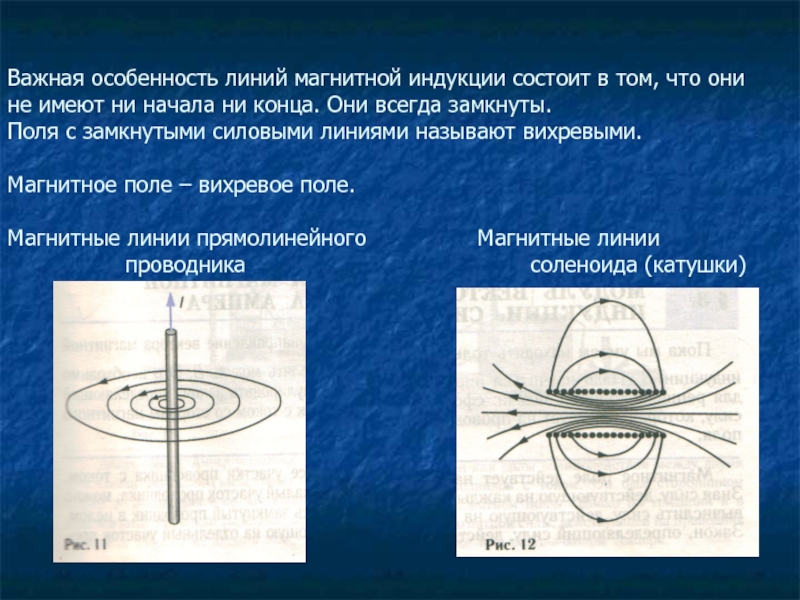 имеют ни начала ни конца. Они всегда замкнуты. Поля с замкнутыми силовыми линиями называют вихревыми. Магнитное поле – вихревое поле. Магнитные линии прямолинейного Магнитные линии проводника соленоида (катушки)