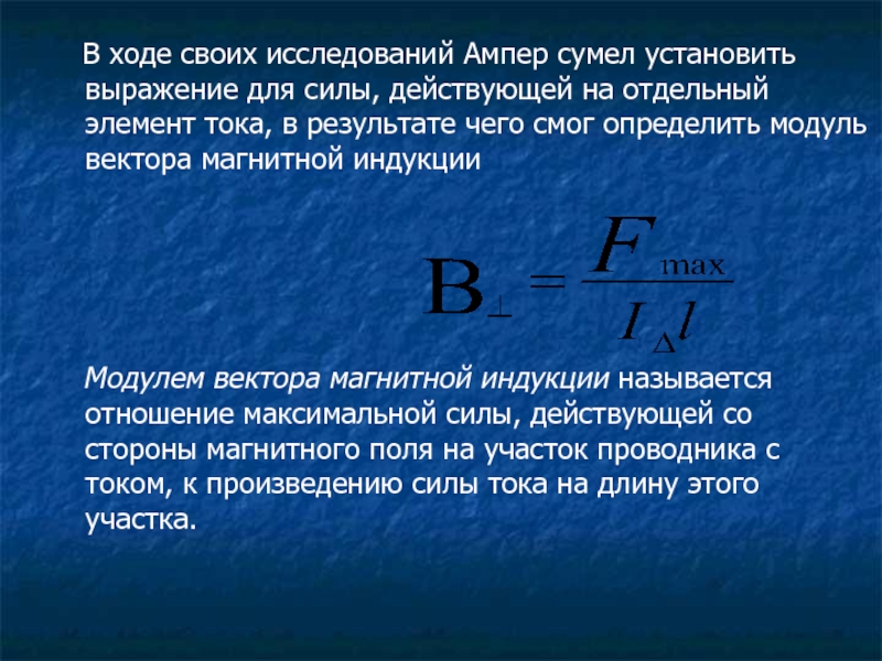 для силы, действующей на отдельный элемент тока, в результате чего смог определить модуль вектора магнитной индукции