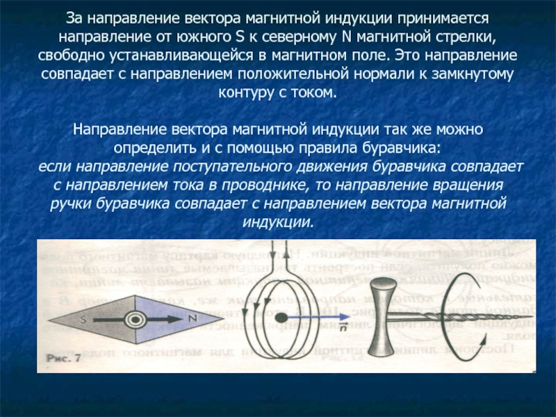 северному N магнитной стрелки, свободно устанавливающейся в магнитном поле. Это направление совпадает с направлением положительной нормали к замкнутому контуру с током. Направление вектора магнитной индукции так же можно определить и с помощью правила буравчика: если направление поступательного движения буравчика совпадает с направлением тока в проводнике, то направление вращения ручки буравчика совпадает с направлением вектора магнитной индукции.