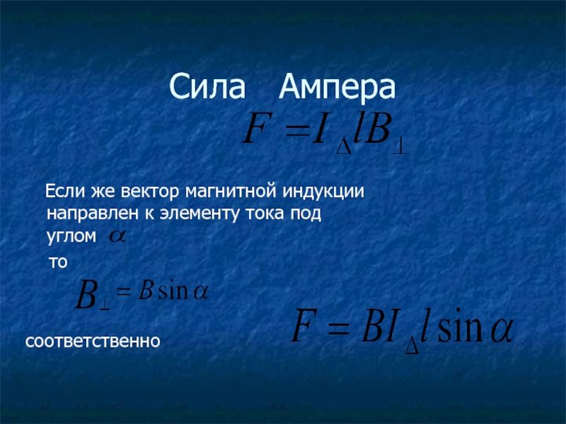 Сила ампера равна произведению вектора магнитной индукции на силу тока, длину участка проводника и на синус угла между магнитной индукцией и участком проводника