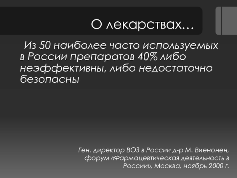 Ген. директор ВОЗ в России д-р М. Виенонен, форум «Фармацевтическая деятельность в России», Москва, ноябрь 2000 г.