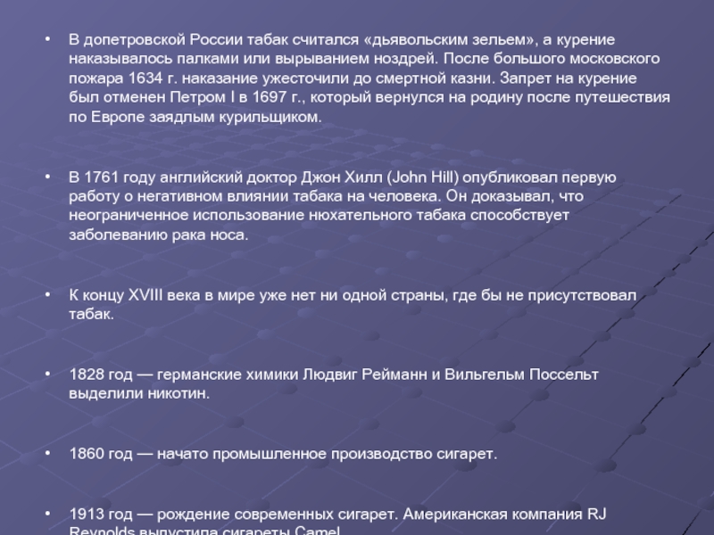 Слайд 3В допетровской России табак считался «дьявольским зельем», а курение наказывалось палками