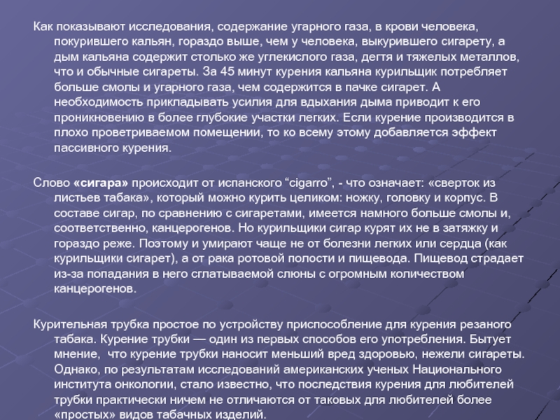 гораздо выше, чем у человека, выкурившего сигарету, а дым кальяна содержит столько же углекислого газа, дегтя и тяжелых металлов, что и обычные сигареты. За 45 минут курения кальяна курильщик потребляет больше смолы и угарного газа, чем содержится в пачке сигарет. А необходимость прикладывать усилия для вдыхания дыма приводит к его проникновению в более глубокие участки легких. Если курение производится в плохо проветриваемом помещении, то ко всему этому добавляется эффект пассивного курения.