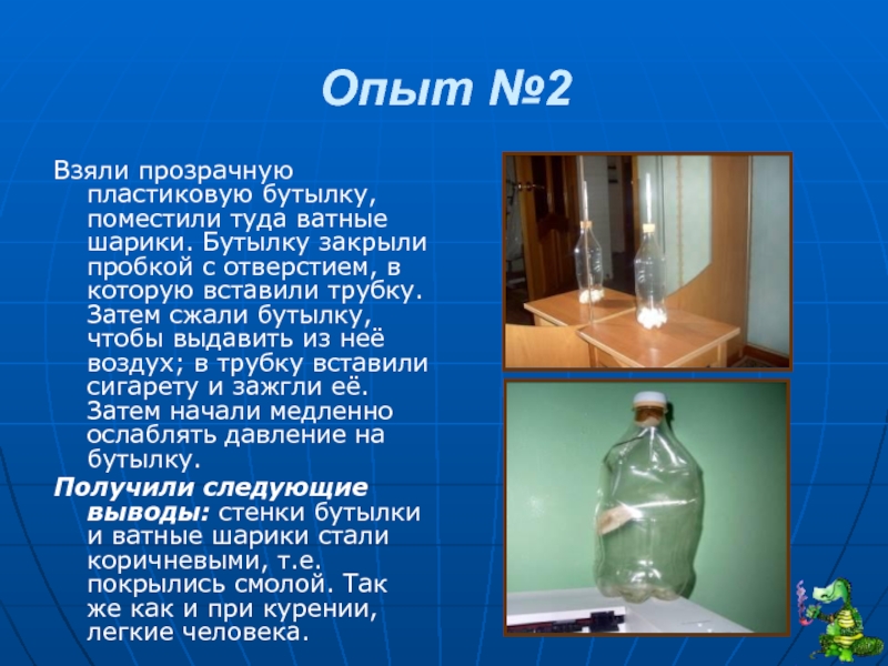 Получили следующие выводы: стенки бутылки и ватные шарики стали коричневыми, т.е. покрылись смолой. Так же как и при курении, легкие человека.