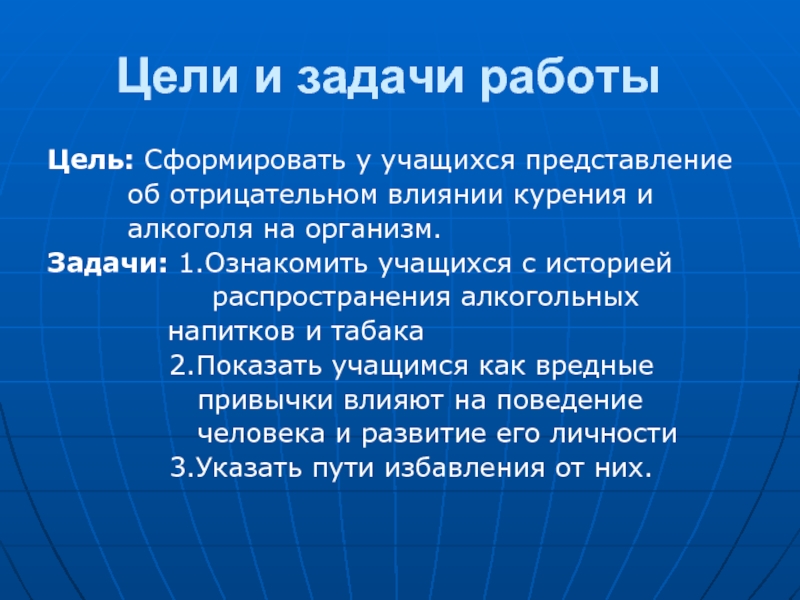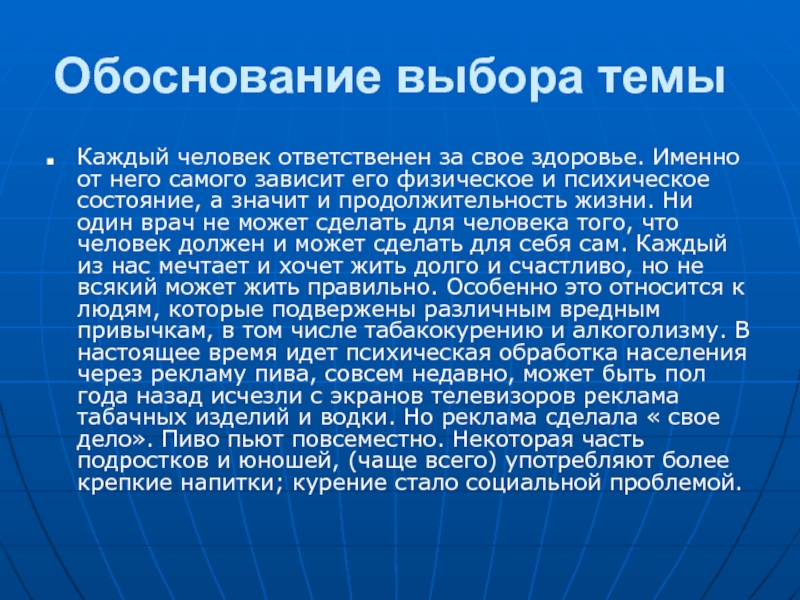 него самого зависит его физическое и психическое состояние, а значит и продолжительность жизни. Ни один врач не может сделать для человека того, что человек должен и может сделать для себя сам. Каждый из нас мечтает и хочет жить долго и счастливо, но не всякий может жить правильно. Особенно это относится к людям, которые подвержены различным вредным привычкам, в том числе табакокурению и алкоголизму. В настоящее время идет психическая обработка населения через рекламу пива, совсем недавно, может быть пол года назад исчезли с экранов телевизоров реклама табачных изделий и водки. Но реклама сделала « свое дело». Пиво пьют повсеместно. Некоторая часть подростков и юношей, (чаще всего) употребляют более крепкие напитки; курение стало социальной проблемой.