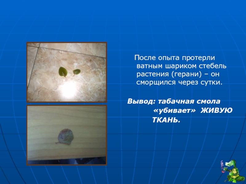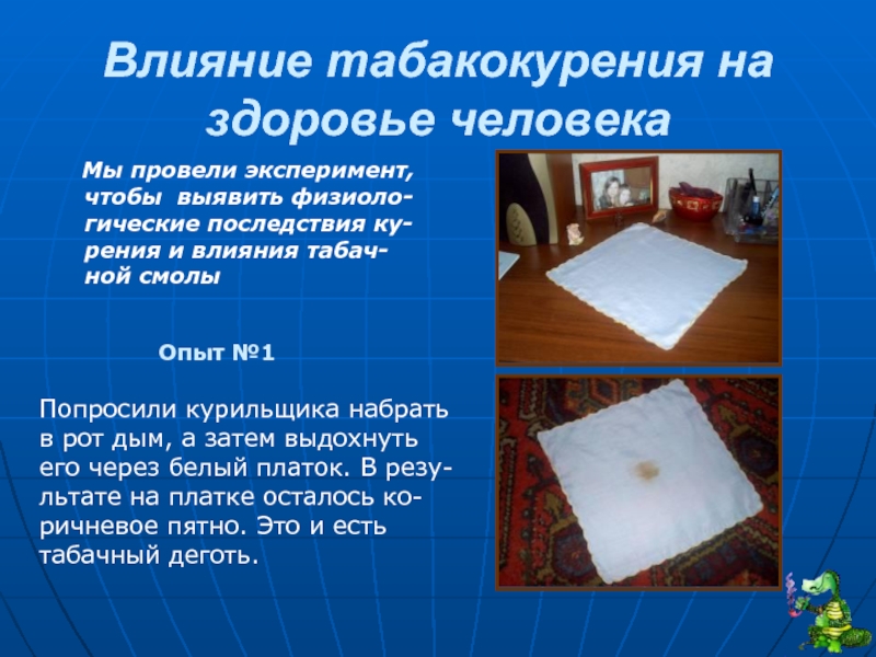 Попросили курильщика набрать в рот дым, а затем выдохнуть его через белый платок. В резу-льтате на платке осталось ко-ричневое пятно. Это и есть табачный деготь.