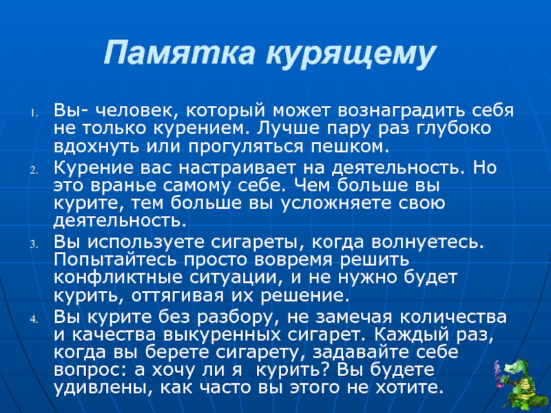 Курение вас настраивает на деятельность. Но это вранье самому себе. Чем больше вы курите, тем больше вы усложняете свою деятельность.