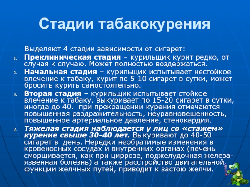 Тяжелая стадия наблюдается у лиц со «стажем» курение свыше 30-40 лет. Выкуривают до 40-50 сигарет в день. Нередки необратимые изменения в кровеносных сосудах и внутренних органах (печень сморщивается, как при циррозе, поджелудочная железа- язвенная болезнь) а также расстройство двигательной функции желчных путей, приводит к застою желчи.