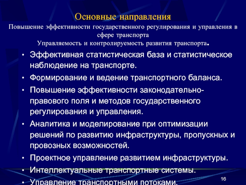 16. Развитие системы государственного управления развитием транспортной системы для увязки долгосрочного, среднесрочного и текущего планирования