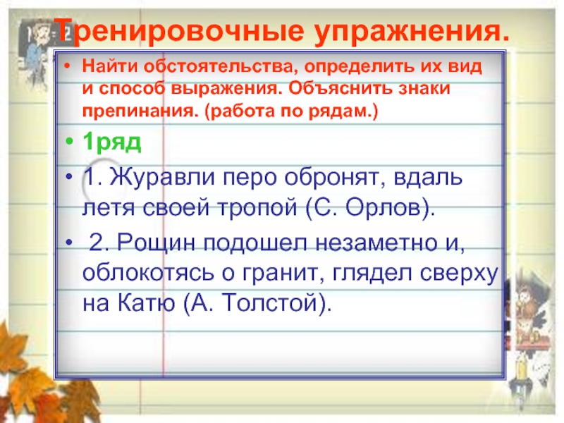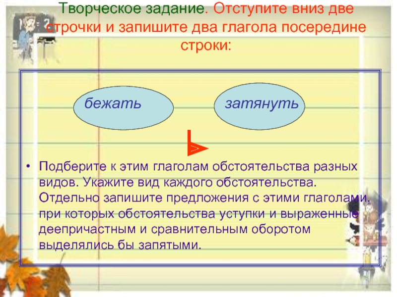 Подберите к этим глаголам обстоятельства разных видов. Укажите вид каждого обстоятельства. Отдельно запишите предложения с этими глаголами, при которых обстоятельства уступки и выраженные деепричастным и сравнительным оборотом выделялись бы запятыми.