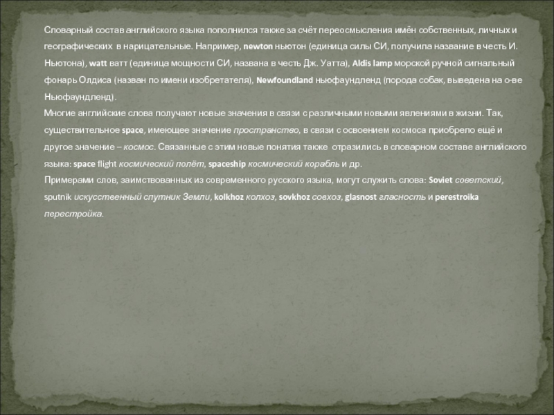 Слайд 14Словарный состав английского языка пополнился также за счёт переосмысления имён собственных,
