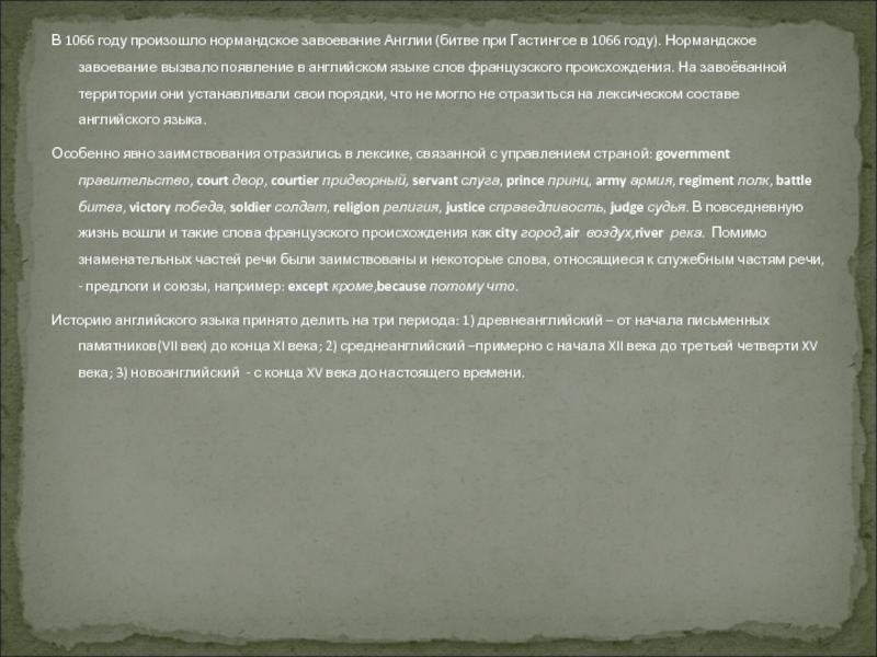 1066 году). Нормандское завоевание вызвало появление в английском языке слов французского происхождения. На завоёванной территории они устанавливали свои порядки, что не могло не отразиться на лексическом составе английского языка.