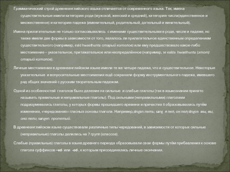 Слайд 9Грамматический строй древнеанглийского языка отличается от современного языка. Так, имена существительные