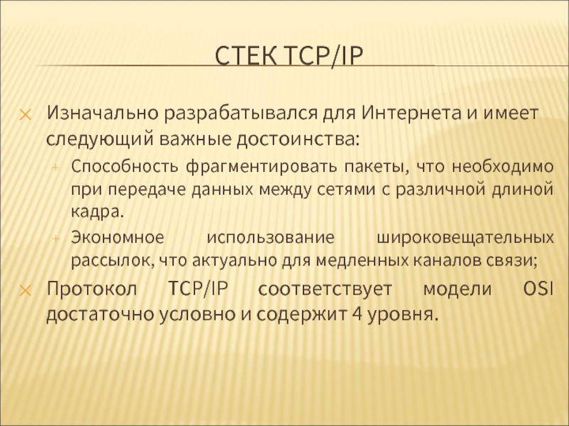 Протокол TCP/IP соответствует модели OSI достаточно условно и содержит 4 уровня.