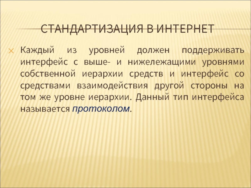 нижележащими уровнями собственной иерархии средств и интерфейс со средствами взаимодействия другой стороны на том же уровне иерархии. Данный тип интерфейса называется протоколом.