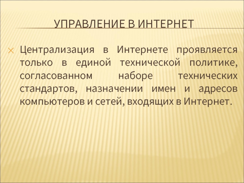 Слайд 6Централизация в Интернете проявляется только в единой технической политике, согласованном наборе
