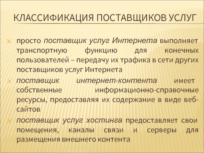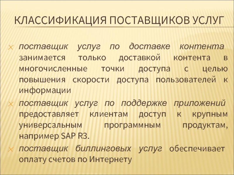 Слайд 8КЛАССИФИКАЦИЯ ПОСТАВЩИКОВ УСЛУГ