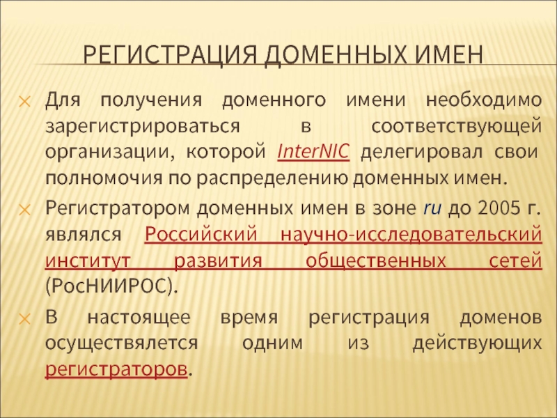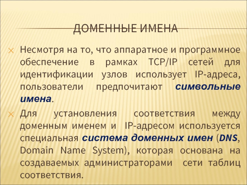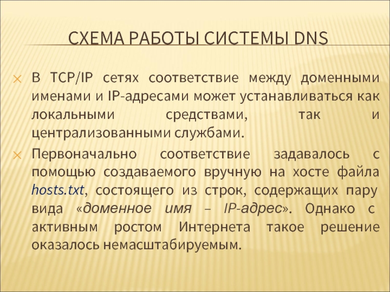 Первоначально соответствие задавалось с помощью создаваемого вручную на хосте файла hosts.txt, состоящего из строк, содержащих пару вида «доменное имя – IP-адрес». Однако с активным ростом Интернета такое решение оказалось немасштабируемым.