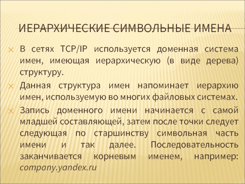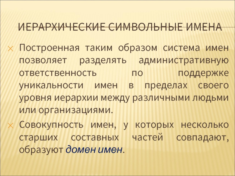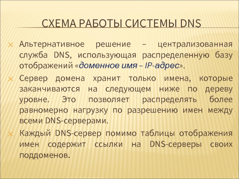 Сервер домена хранит только имена, которые заканчиваются на следующем ниже по дереву уровне. Это позволяет распределять более равномерно нагрузку по разрешению имен между всеми DNS-серверами.