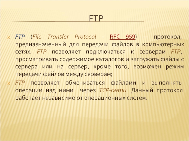 FTP (File Transfer Protocol - RFC 959) — протокол, предназначенный для