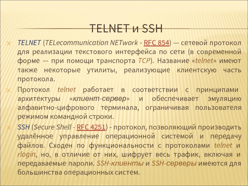 Протокол telnet работает в соответствии с принципами архитектуры «клиент-сервер» и обеспечивает эмуляцию алфавитно-цифрового терминала, ограничивая пользователя режимом командной строки.