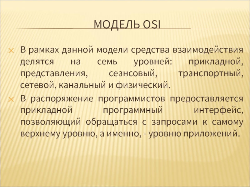 В рамках данной модели средства взаимодействия делятся на семь уровней: