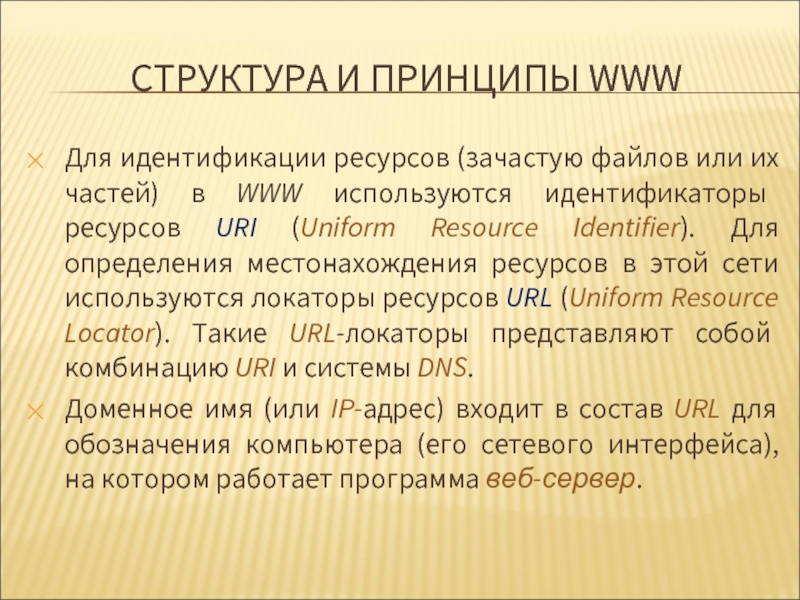 в WWW используются идентификаторы ресурсов URI (Uniform Resource Identifier). Для определения местонахождения ресурсов в этой сети используются локаторы ресурсов URL (Uniform Resource Locator). Такие URL-локаторы представляют собой комбинацию URI и системы DNS.