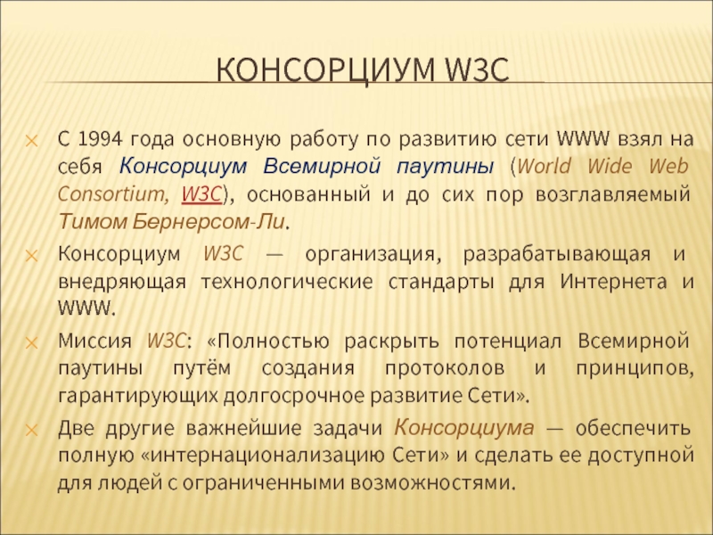 на себя Консорциум Всемирной паутины (World Wide Web Consortium, W3C), основанный и до сих пор возглавляемый Тимом Бернерсом-Ли.