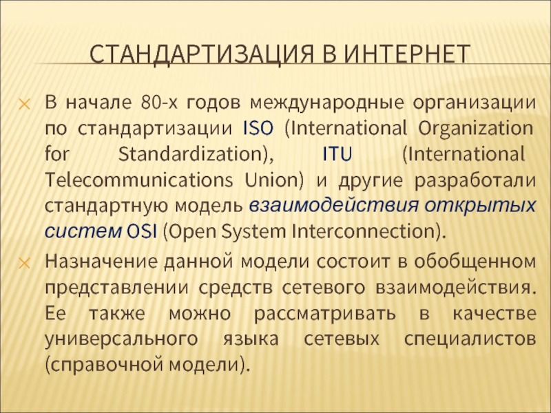 (International Organization for Standardization), ITU (International Telecommunications Union) и другие разработали стандартную модель взаимодействия открытых систем OSI (Open System Interconnection).