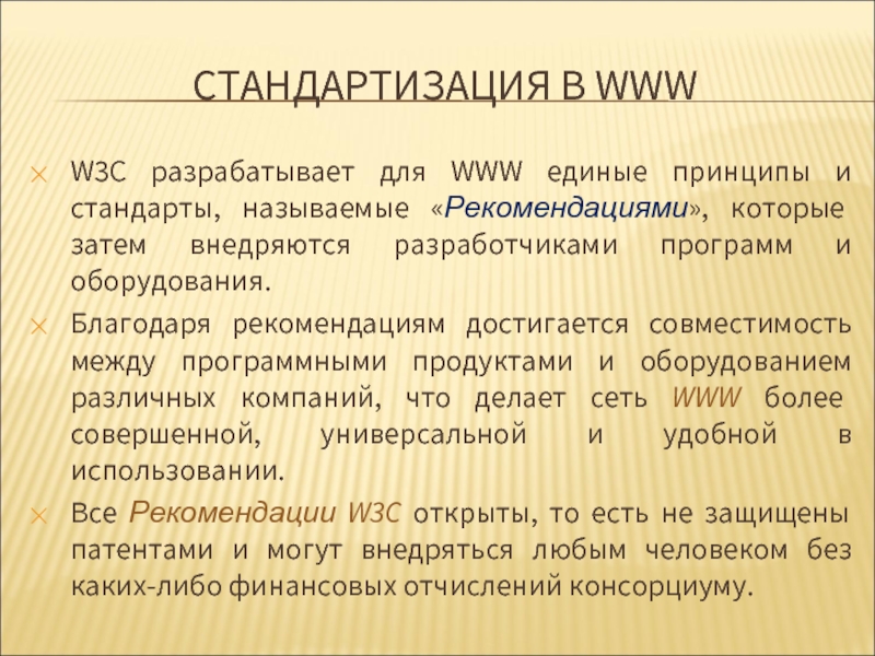Благодаря рекомендациям достигается совместимость между программными продуктами и оборудованием различных компаний, что делает сеть WWW более совершенной, универсальной и удобной в использовании.